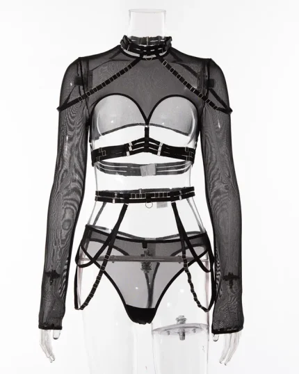 This mesh lingerie set blends elegance and sensuality in a complete ensemble featuring a bra, panty, garter belt, and gloves.