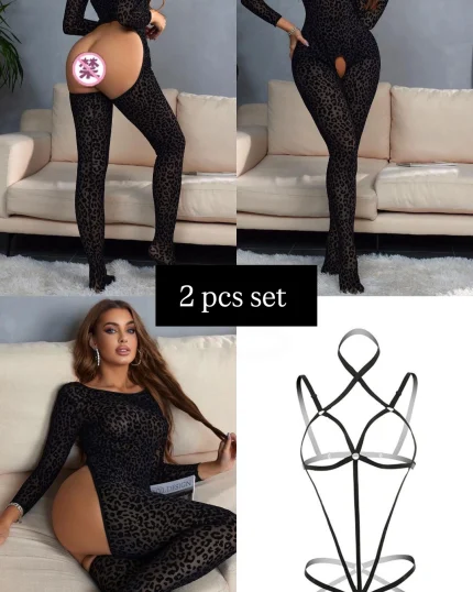 Bold. Wild. Unforgettable. A 2-piece set featuring: – Leopard long-sleeve bodysuit with open-side cut-outs – Matching strappy body Designed to