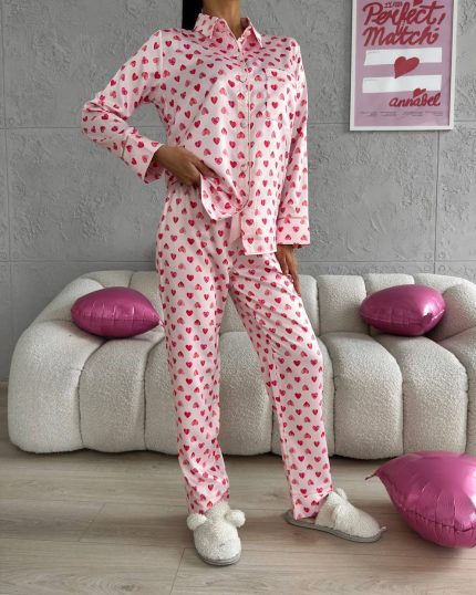 soft satin pajama set in blush pink, adorned with playful heart prints and finished with delicate piping. Designed for cozy
