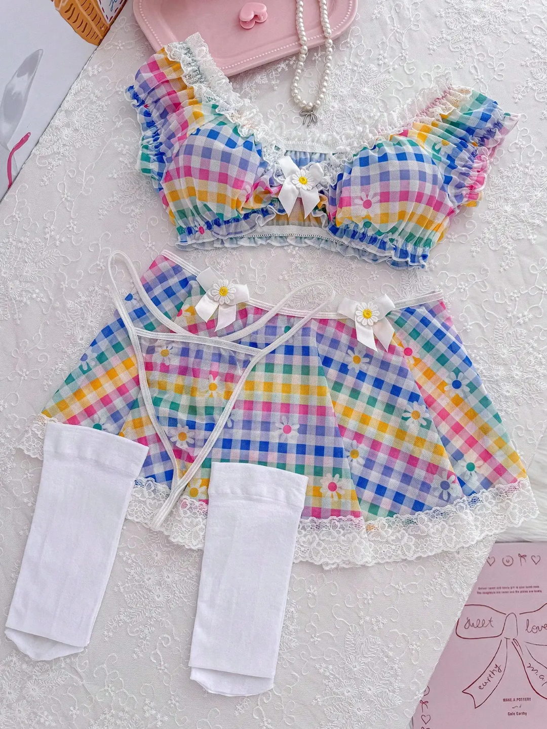 This rainbow gingham set features a flirty off-shoulder top with delicate lace trims, paired with a flowy mini skirt that adds movement and softness to every step.